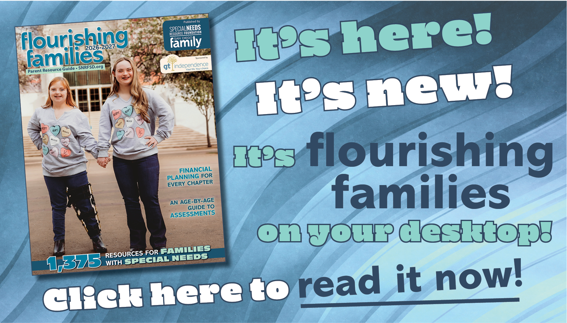 Flourishing Families is the parent resource guide for families with special needs that contains relevant resources in San Diego and Imperial Counties. Read informative articles that offer help and encouragement to families with special needs. Sign up to receive our bi-monthly eNewsletter, keeping you connected to current and relevant information in the community.